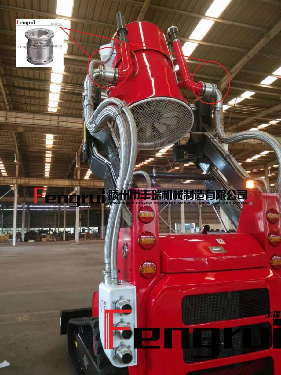 在這款機器人的車身上安裝3種用于不同火場形勢的滅火設備,泡沫泡、智能控制的阿密龍水炮,多達320個噴水口的圓筒水炮通過60000立方米/每小時的大功率的液壓馬達可噴出大量水霧,可自行攜帶消防水進行滅火,圓筒水炮上高速旋轉(zhuǎn)的液壓馬達還具有排煙功能,對一些濃煙的火場起到了決定性的作用。因此為司為根據(jù)多功能消防遙控機器人在復雜嚴酷的火場環(huán)境工作的特性,要具有耐外部高溫對密封結(jié)構(gòu)和元器件的損壞、耐因爆炸濃煙里夾雜的顆粒粉塵對密封結(jié)構(gòu)內(nèi)部元氣件的磨損,還要具備高壓高速的環(huán)境下有很好的工作狀態(tài),配合水泡完成滅火的特種作業(yè)。經(jīng)過多次對密封元件和材質(zhì)的試驗,最終我司為多功能消防遙控機器人配套了包括回轉(zhuǎn)接頭、高壓金屬軟管、液壓滑環(huán)等多種旋轉(zhuǎn)動態(tài)密封關鍵元件的解決方案。得到了廠家的好評,更為無人遠程遙控特征設備助力,為我們廣大消防員不在冒險進入火場減少傷亡盡了微薄的力量,盡了滕州豐瑞機械的社會責任。有轉(zhuǎn)動的地方就有豐瑞旋轉(zhuǎn)接頭。
